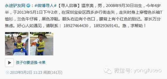 2013年该微博曾发动粉丝帮一深圳听众找孩子,取得很大社会反响,孩子在20天内成功找到。