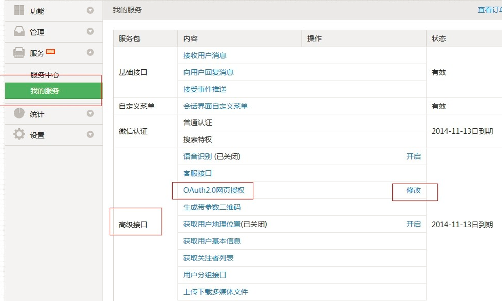 二、 选择服务→我的服务→高级接口→OAuth2.0网页授权,处点击修改按钮,如下图页面所示;