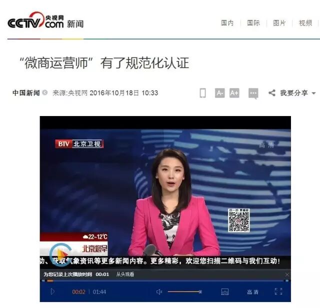 10月18日,央视网和北京电视台报道了微商运营已经纳入国家资格认证考试,而北京首批55名微商从业人员已参加了本次考试,这说明微商已经进入正规的职业认证体系,这次国家对微商职业进行明确的认可,陆续国家还将对微商行业进行全面的管理和规划,由此可见微商不但是大势所需,而且还将会成为商业体系的更有效补充和国家引导的商业模式。